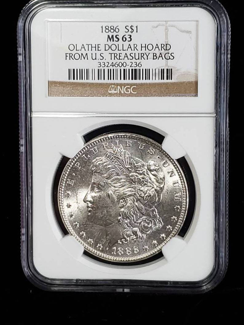 We accept Crypto - Message first before checking out! 1886 MS 63 Silver Morgan Dollar, NGC MS 63 Silver Coin . Olathe Dollar Hoard - From the U.S Treasury Bags ! Lot # 1494 certified by NGC and sealed in an airtight holder. The coin/ bar pictured is the exact item you will receive. Check out our reviews! Buy with confidence. Item will be shipped USPS First class insured in a secure padded bubbler envelope 1-3 Business days after receiving your order. If this will be a gift feel free to send us the message you wish displayed. . Orders over $300 will all be shipped with Signature Confirmation and Insurance. If you would like to order multiple items on this website, please message me directly so I can send you a customized invoice at a discount.