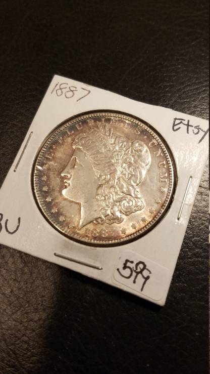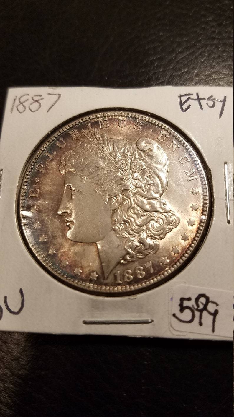 We accept Crypto - Message first before checking out! 100% Genuine 1887 Morgan Silver Dollar BU - nice toning! . Lot#599. Shipped with USPS First Class Package. . Orders over $300 will all be shipped with Signature Confirmation and Insurance. If you would like to order multiple items on this website, please message me directly so I can send you a customized invoice at a discount.