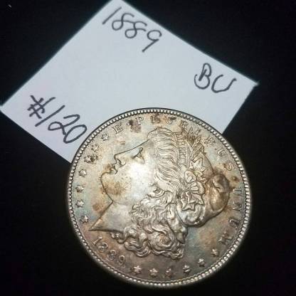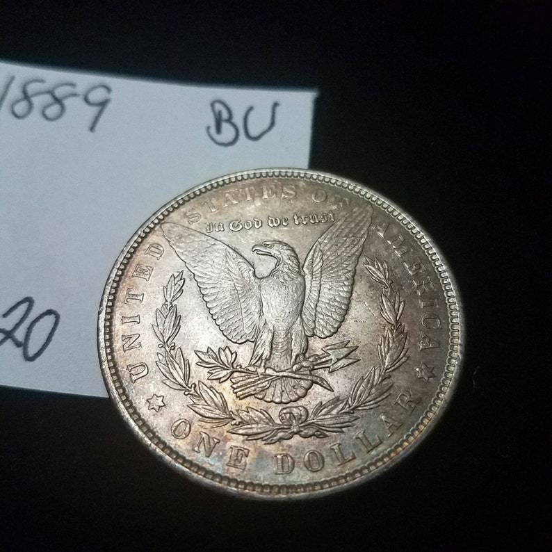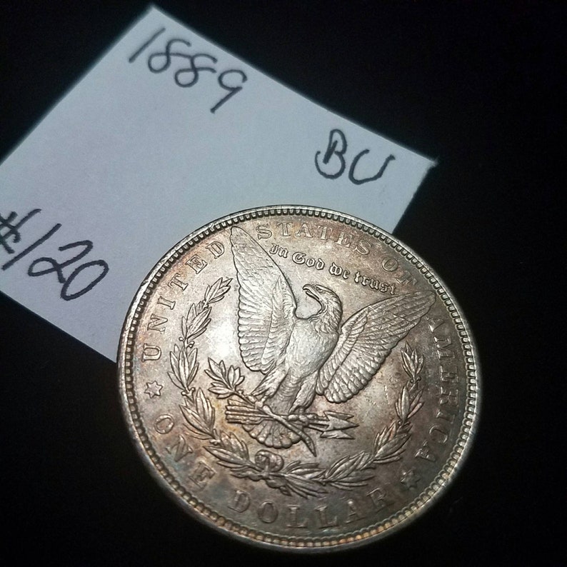 We accept Crypto - Message first before checking out! 100% Genuine 1889 BU Gem Morgan Silver Dollar! Rainbow toning! Lot#126. Shipped with USPS First Class Package. . Orders over $300 will all be shipped with Signature Confirmation and Insurance. If you would like to order multiple items on this website, please message me directly so I can send you a customized invoice at a discount.