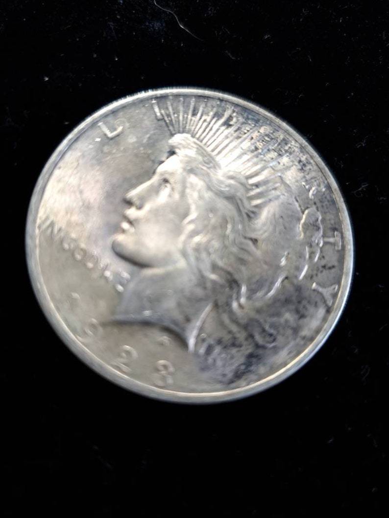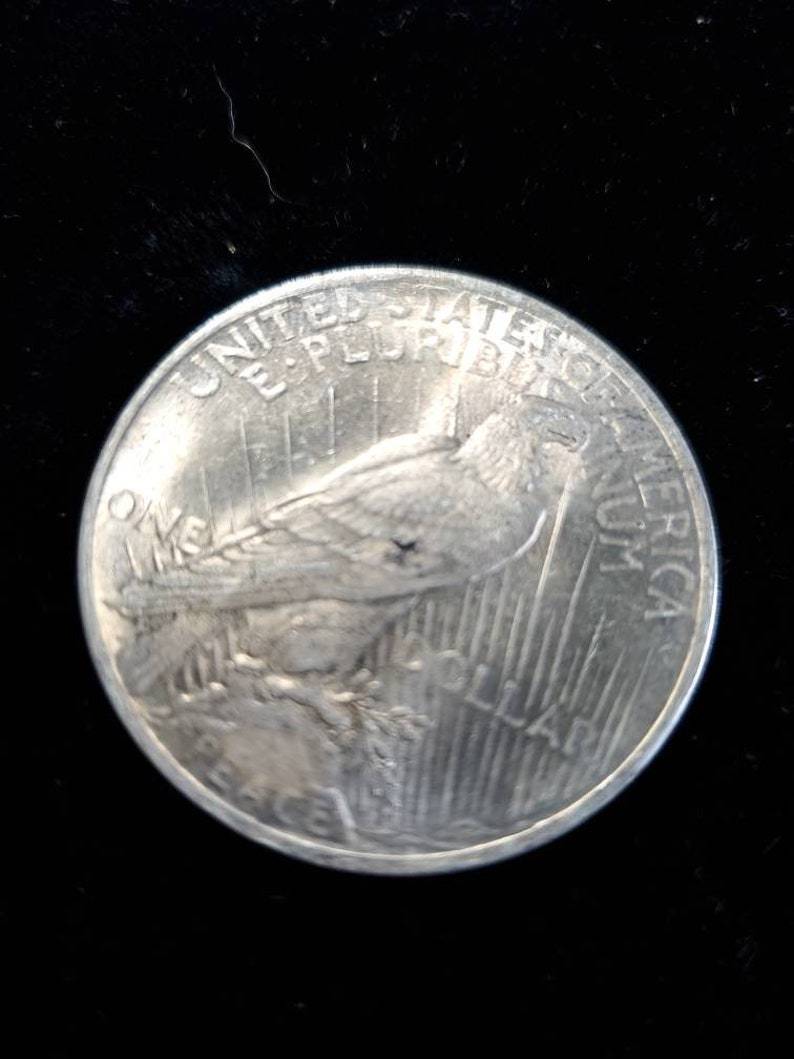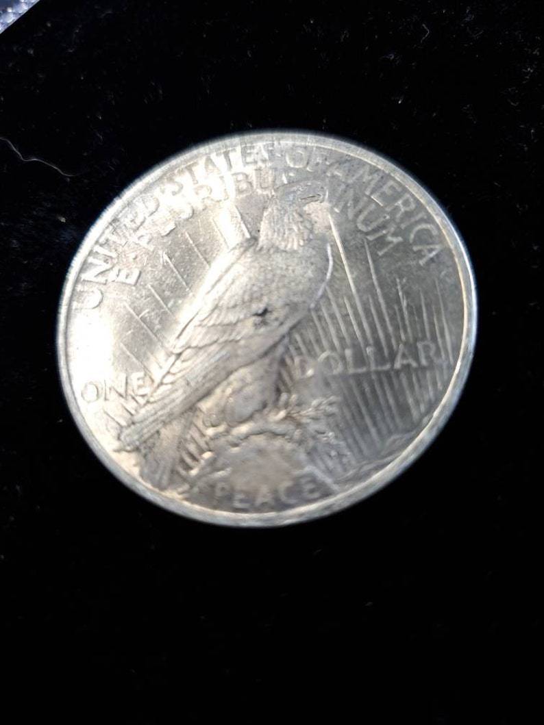 We accept Crypto - Message first before checking out! 1923 Silver Peace Dollar AU - 90% silver. The coin/ bar pictured is the exact item you will receive. Check out our reviews! Buy with confidence. Item will be shipped USPS First class insured in a secure padded bubbler envelope 1-3 Business days after receiving your order. Please leave feedback after you receive your order. If this will be a gift feel free to send us the message you wish displayed. . Orders over $300 will all be shipped with Signature Confirmation and Insurance. If you would like to order multiple items on this website, please message me directly so I can send you a customized invoice at a discount.